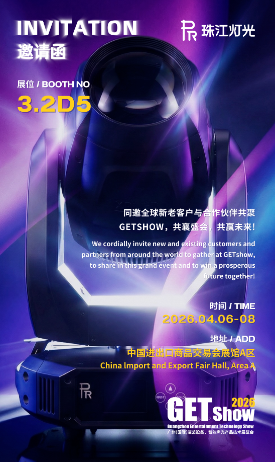 以光为媒,共赴盛会!珠江灯光诚挚邀请全球新老客户与合作伙伴,4月6-8日,相聚2026年广州(国际)演艺设备、智能声光产品技术展览会(GETshow),一同见证智能光影的前沿力量与中国智造的卓越风采!