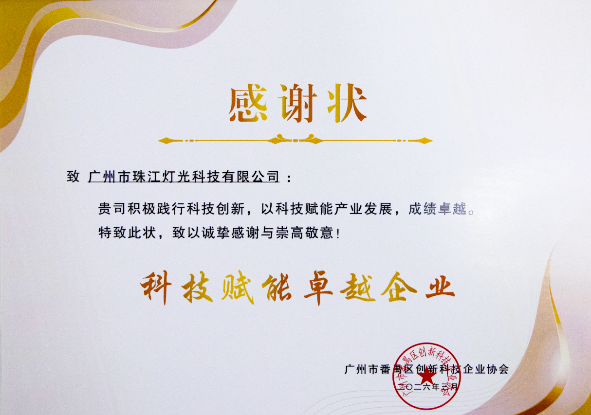 珠江灯光凭借科创驱动、智造引领的硬核实力与在产业高质量发展中的突出贡献,荣获「科技赋能卓越企业」称号,彰显民族灯光品牌在技术创新与产业升级中的标杆地位。