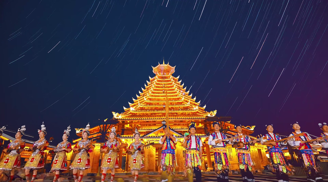 夜幕下的雪峰鼓楼如梦如幻,是榆树湾·青春广场标志性夜景之一。在这里,游客既能在雪峰鼓楼下感受千年乡土与民族风情,在情景演艺的光影互动中,沉浸于洪商兴盛时期“商贾骈集、货财辐辏、万屋鳞次”的码头江湖。